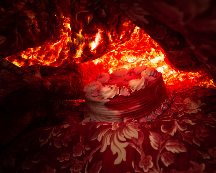 Many of the cakes were made by Cig’s twelve-year-old daughter Scout, often impossibly precarious, decorated with wildly dripping abandon, even sent inexplicably floating on a river or into an inferno. These are confections gone wild, hinting at danger, decadence, and the ephemeral nature of beauty. As a series of images, along with the artist’s evocative text, they are a saucy celebration that serve as metaphor for the passing of time—living and dying, full of the sweetness, bitterness, and unknowable elements that we all must navigate. It is at once a party and memento mori—a reminder to stop wasting time, agonizing over the past, and dreading the future. Cig is imploring us to embrace our one wild life with optimism while acknowledging its heartbreaks and complexities.